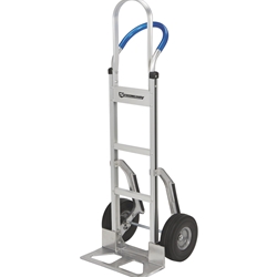 This Strongway Aluminum Hand Truck/Stair Skid features a continuous handle and is easy to climb stairs using the stair skids. This truck works well in the vertical position and is ideal for transporting small crated or long narrow boxes. 10" polyurethane wheels roll smoothly.
