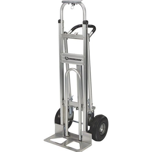 This Strongway 3-in-1 Aluminum Hand/Platform Truck with 10" fully pneumatic wheels and swivel casters is capable of supporting 550 lbs in hand truck mode and 770 lbs in platform truck mode. This 3-in-1 unit includes a plate extender to ease the handling of large loads. The continuous-flow handle is ergonomic and comfortable. The toe plate is 18"W x 7.5"D.