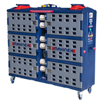 The Makinex mobile charging pod (MCP) provides safe, secure storage for battery charging devices, with keyed access to six separate lockers. The MCP accommodates cordless tools, batteries, and battery bank chargers, with one 15A GFCI outlet available for each locker. Each door has large inspection holes for monitoring charge levels, while also providing ventilation for equipment inside. Not only does the MCP design reduce trip hazards and keep the jobsite organized, the lightweight polyethylene construction is fire rated for peace of mind. And for safety inspections, the plugs are positioned outside the lockers for equipment tag reading.