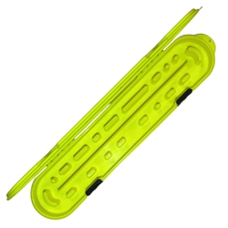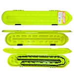The hi-viz yellow Chain Locker Pro Series storage case is simple and versatile solution for organizing and storing multiple chainsaw chains up to 36 In. long. This case features two rows for storing chains, with tabs to perfectly fit chains of nearly any length, and thickness up to .404 pitch. Even long chains are easily secured using the crescent shaped tabs on either end to make a tidy loop for secure storage. With its two-inch depth, the Chain Locker can stack multiple chains, and even store tools like t-wrenches and files. The Chain Locker is also proudly made in the USA, and built tough with UV enhanced polypropylene, and stainless steel pins on the hinges and latches.